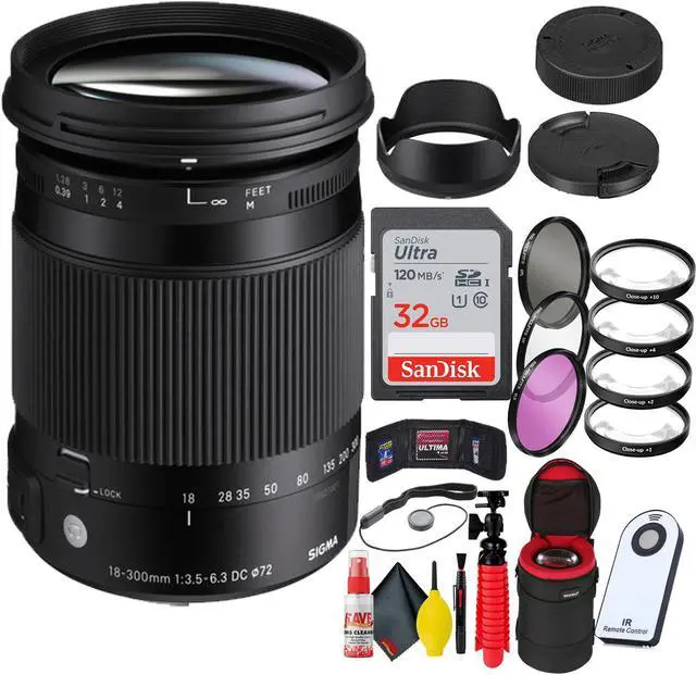 • Bundle Items Include: 1 x Sigma 18-300mm f/3.5-6.3 DC Macro OS HSM Contemporary Lens for Nikon F + 1 x 32GB SD Card + 1 x Close UP Filter + 1 x UV Filter Kit + 1 x Lens Cap + 1 x Tripod + 1 x Wireless Remote Shutter + 1 x Memory Card Wallet + 1 x Lens Case + 1 x Cleaning Kit. As part of the Contemporary line within Sigma's Global Vision series, this lens is designed to achieve a balance between convenience and performance, and meshes a compact, lightweight build and versatile handling with notable optical attributes. All-in-one zoom is designed for DX-format Nikon F-mount cameras, and provides a 27-450mm equivalent focal length range.. One Special Low Dispersion (SLD) and Four F Low Dispersion (FLD) elements are featured in the optical design and help to reduce color fringing and chromatic aberrations for improved clarity and color accuracy. Three aspherical elements are used to help limit distortion and spherical aberrations and also contribute to greater overall sharpness and