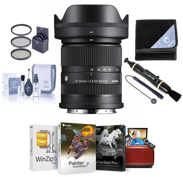 Sigma 18-50mm f/2.8 DC DN Contemporary Lens for Sony E, Bundle with 55mm Filter Kit, Lens Cleaner, Lens Wrap, Lens Cap Tether, Cleaning Kit, Mac Software Kit