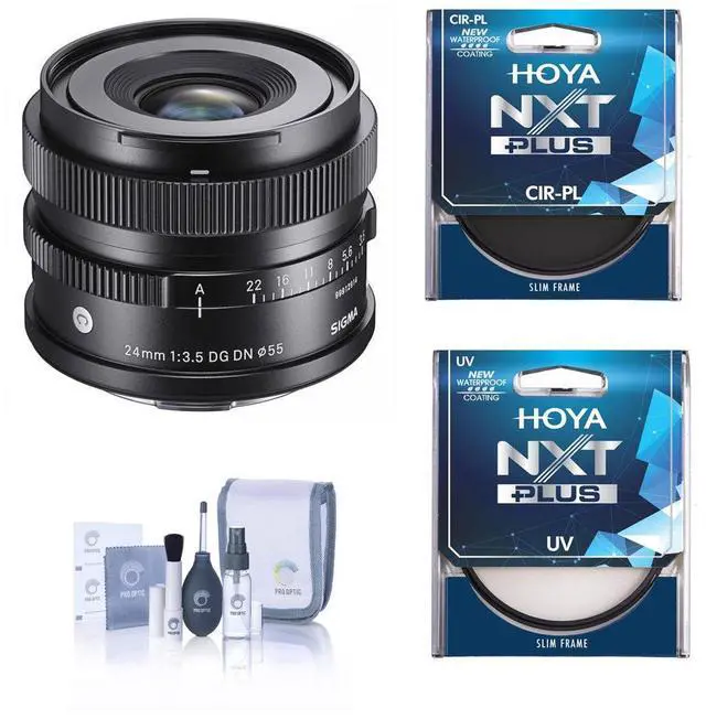 All I Series lenses, including this one, have an all-metal construction. The precision-cut aluminum parts not only give the barrel a sleek, stylish finish but also provide superb durability, which improves the quality of the entire product. The Sigma 24mm F 3.5 DG DN Contemporary lens is compatible with a 55mm filter size, matching the outermost diameter and similar overall lengths of the 45mm F 2.8 DG DN Contemporary lens. This product bundle also includes the Hoya NXT Plus 55mm UV+CPL Filter Kit and a cleaning kit, offering added value for photographers.