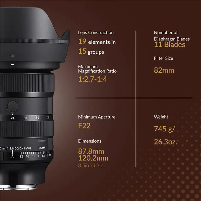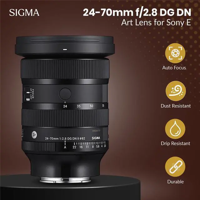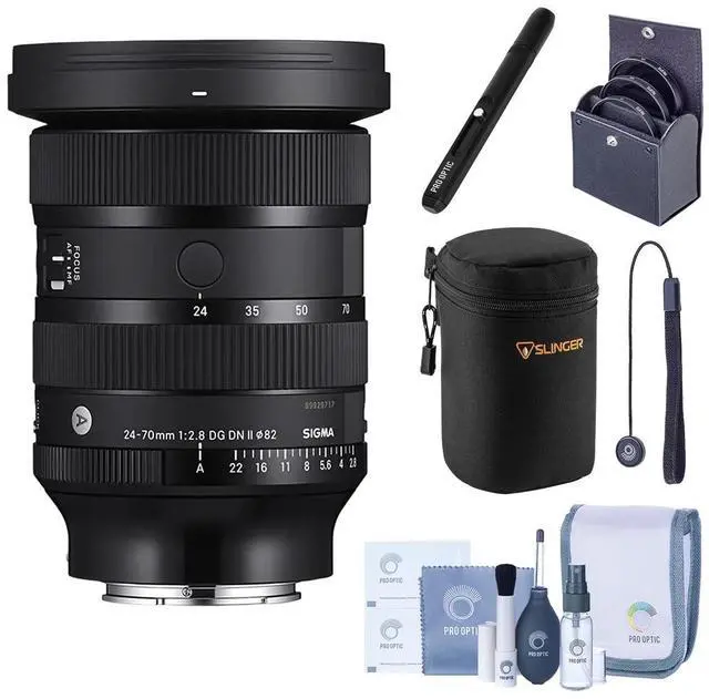 The Sigma 24\u201370mm F2.8 DG DN II Art Lens for Sony E bundle offers a versatile, professional-grade zoom lens paired with essential accessories for protection and maintenance. Featuring a fast constant f/2.8 aperture, it delivers excellent low-light performance and smooth background blur throughout the zoom range, while its advanced high-resolution optics provide outstanding sharpness, clarity, and minimal distortion from edge to edge. Designed specifically for full-frame Sony E-mount mirrorless cameras, the DG DN construction ensures improved balance and portability without sacrificing performance. Built to Art Series standards, the lens boasts premium durability and exceptional image quality. The bundle includes a padded soft lens case for added protection, an 82mm UV filter to reduce haze and safeguard the front element, a dual-sided lens cleaning pen, a complete optics care kit for thorough maintenance, and a cap keeper to prevent accidental lens cap loss