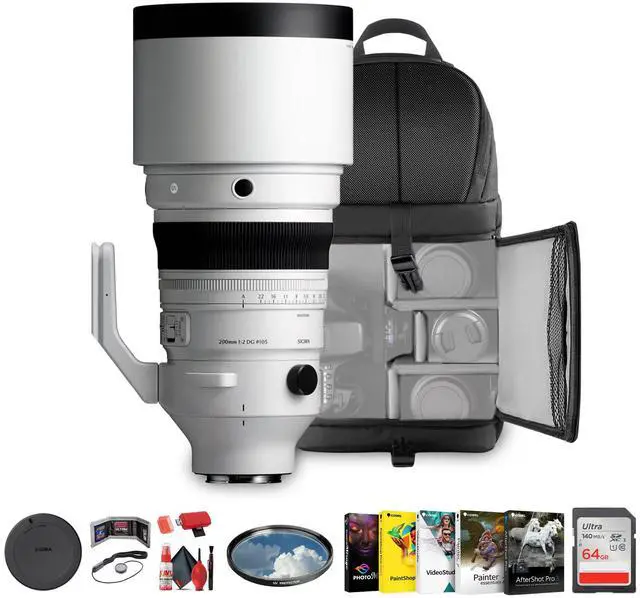 Sigma 200mm f/2 DG OS Sports Lens (Sony E) Cleaning Kit Corel Photo Video & Art Suite Deluxe USB Card Reader SD/microSD Memory Card Wallet Lens Cap Keeper 64GB Memory Card Deluxe Padded Backpack for Camera/Video (Black) MULTICOATED 105MM UV FILTER
