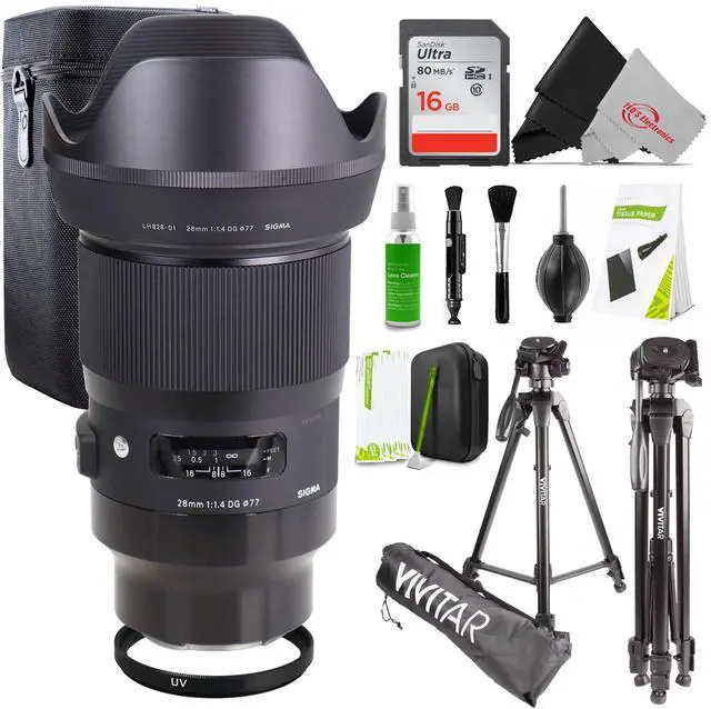 SIGMA 28MM F/1.4 DG HSM ART LENS (SONY E) ACCESSORY BUNDLESigma 28mm f/1.4 DG HSM Art Lens (Sony E)A favored wide-angle prime, the Sigma 28mm f/1.4 DG HSM Art Lens is a versatile lens with a classic broad field of view that suits everything from street shooting to landscape photography. Impressively bright, the fast f/1.4 maximum aperture is ideal for working in low-light conditions and also offers greater control over depth of field for isolating subject matter. An advanced optical design is employed, which uses both low dispersion glass and aspherical elements to reduce chromatic and spherical aberrations for greater clarity and sharpness. A Super Multi-Layer Coating is also featured, and suppresses ghosting and flare for improved contrast and color accuracy.