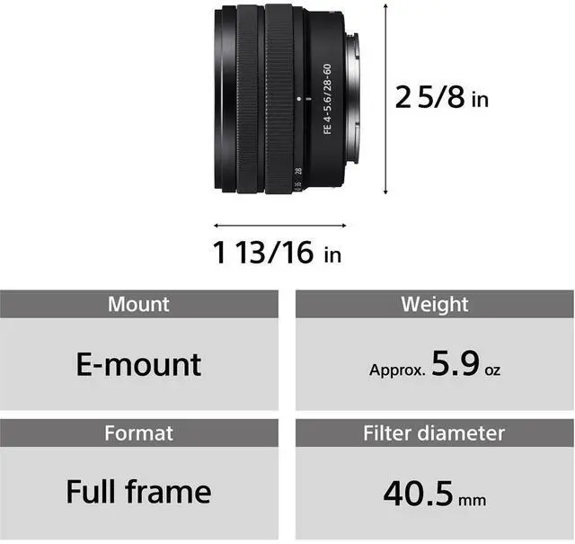 The Portable Powerhouse Standard ZoomImpressively compact and versatile, the Sony FE 28-60mm f/4- 5.6 is a wide-angle to long-normal zoom characterized by its retractable design and sleek profile. Its svelte design makes this lens ideal for walkaround, everyday shooting, and the flexible focal length range benefits a wide range of subject types, from street shooting to portraiture to travel photography. Small and LightSmall size and lightweight design is what this lens is all about, meaning it's the perfect companion for casual shooting days when a single, versatile, and portable lens is most desirable.