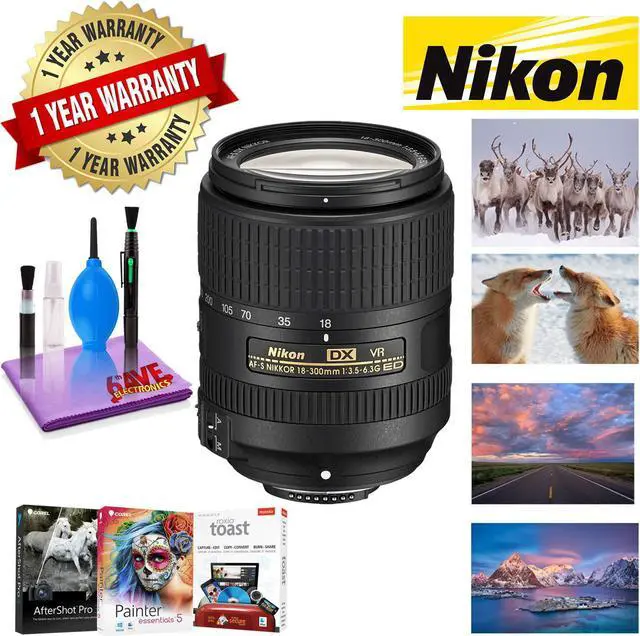Manufacturer Included Items: Nikon AF-S DX NIKKOR 18-300mm f/ 3.5 - 6.3G ED VR Lens67mm Snap-On Lens CapLF-4 Rear Lens CapBundle Items Include: 1 x NIKON 18-300MM F/ 3.5 - 6.3G ED AF-S DX VR LENS 1 x Corel Mac Photo Essentials Software Kit - Includes Corel AfterShot, Corel Painter Essentials 5, Roxio Studio Pro1 x 1 Year Extended Warranty1 x Table Top Tripod, Lens Cleaning Kit, LCD Protector1 x High Quality Dust Blower1 x Lens Pen Cleaner