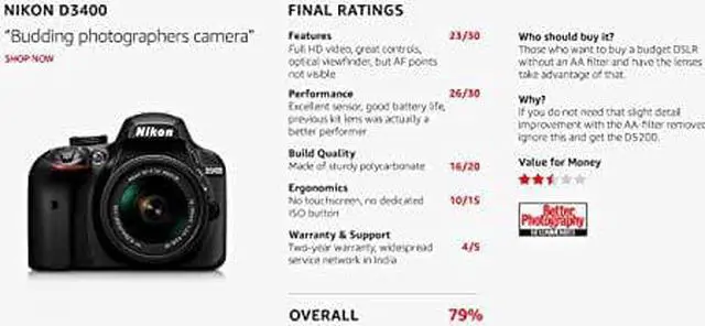 Before the Nikon D3400 Digital SLR Camera with 18-55mm Lens (Black), you chose your smartphone camera for convenience. Zooming was clumsy. Shooting in low light was nearly impossible. Capturing fast action was a game of luck. But after the D3400, you'll see that you were compromising image quality. That some of the greatest photos happen when the light is low. That fast action can be frozen in perfect clarity. And that a camera and a smartphone can work together in harmony to make the photos you share absolutely amazing.