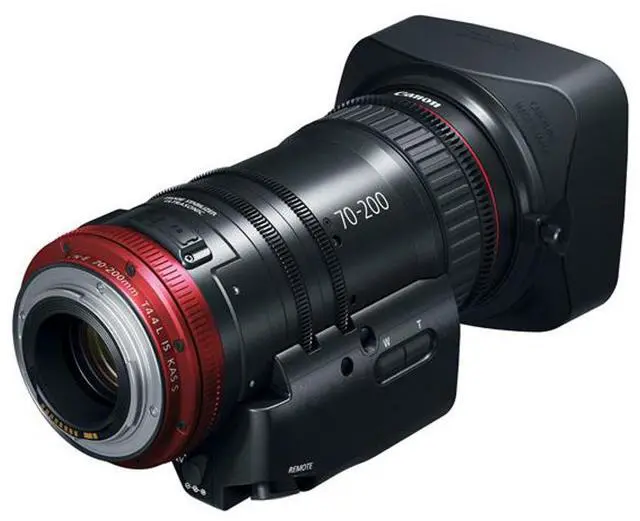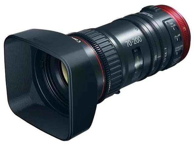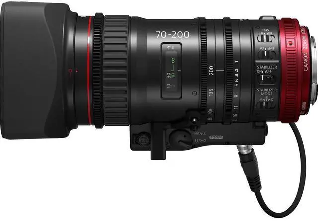 Designed for use with Canon EF mount cameras, this lens is optimized for video applications. It features a compact size of just 7.2 inches in length and a weight of only 2.76 lbs, ensuring outstanding mobility. With full external servo control developed by Canon, you can easily manage zoom, focus, and iris. The lens is compatible with industry-standard lens controllers, including Canon's standard broadcast lens controllers (ZSD-300D/FPD-400D). For handheld operation, the optional ZSG-C10 Zoom Servo Grip can be mounted to the lens. The COMPACT-SERVO 70-200mm T 4.4 EF lens stands out with its three levels of Image Stabilization and incorporated autofocus functions, setting it apart from traditional Super 35mm Cinema lenses.