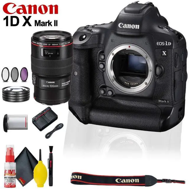 Bringing the shooting speed and video capabilities required by professional multimedia image-makers, the EOS-1D X Mark II is the flagship model within Canon's DSLR lineup, and is characterized by its robust processing capabilities and ability to enable a high-end multimedia workflow. At the heart of the imaging system is a full-frame 20.2MP CMOS sensor and dual DIGIC 6+ image processors, which contribute to fast continuous shooting rates up to 16 fps in live view, 14 fps with full-time AF and AE, and an expanded sensitivity range from ISO 50-409600. The sensor and processor combination also avails DCI 4K video recording at 60 fps and Full HD 1080p recording at 120 fps, along with the ability to record on-board to a CFast 2.0 memory card, or uncompressed Full HD video can be saved via HDMI to an optional external recorder. Benefitting stills shooting is an apt 61-point High Density Reticular AF II system, which includes 41 cross-type points for a high degree of precision in varying light conditions, and video shooting is enhanced by Dual Pixel CMOS AF, which makes its first appearance in a full-frame sensor for smooth, quick, and controllable AF in live view.What's In The Box:Canon EOS-1D X Mark II DSLR Camera (Body Only)LP-E19 Battery Pack (2750mAh)LC-E19 Battery ChargerPlug for North AmericaEC-C6 Focusing ScreenEyecup EgCamera Cover R-F-3Packing CoverWide Strap L7Connect Cover for LP-E4IFC-150U II USB 3.1 Gen 1 Interface Cable for DSLRsCanon Digital Solution DiskBundle Items Include:1 x Canon EF 100mm f/2.8 Macro IS USM Lens1 x 67mm 4 Piece Close-Up Macro Lens Kit1 x 67mm 3 piece Lens Filter Kit (UV, Circular Polarizer, FLD)1 x Cleaning Kit