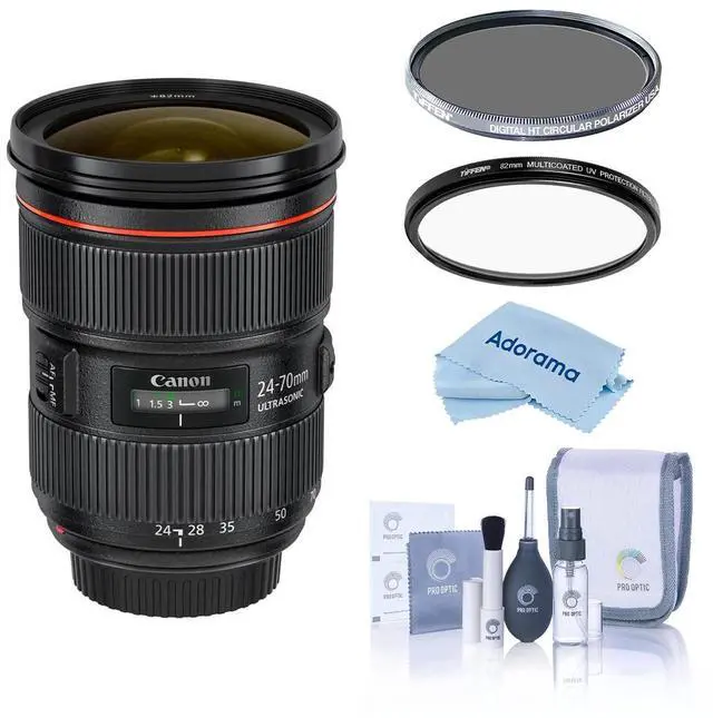 An Exceptional Photography Experience: The Canon EF 24-70mm f/ 2.8L II USM Lens Bundle with Hoya 82mm UV+CPL Filter Kit, Cleaning Kit, and Microfiber ClothThis comprehensive photography kit is meticulously assembled to cater to both beginners and seasoned professionals. It features the highly-regarded Canon EF 24-70mm f/ 2.8L II USM Lens, celebrated for its precision and versatility. Paired with Hoya's NXT Plus 82mm UV and Circular Polarizer Filters, it enhances image clarity and color vibrancy. The ProOptic Cleaning Kit and the 5.8 x 5.8" Adorama Microfiber Cloth ensure your lens remains pristine and smudge-free. Each component of this kit is designed to elevate your photography experience, delivering superior results. The Canon EF 24-70mm f/ 2.8L II USM Lens is a versatile zoom lens designed for full-frame Canon EF-mount DSLRs. It can also be used with APS-C models, transforming into a 38.4 -112mm equivalent focal length range. This adaptability makes it a valuable asset for both professionals and hobbyists. The lens features a bright constant f/ 2.8 maximum aperture, providing uniform illumination across the zoom range. This allows for clear shots in various lighting conditions and enables photographers to experiment with selective focus techniques for a deeper depth of field control.