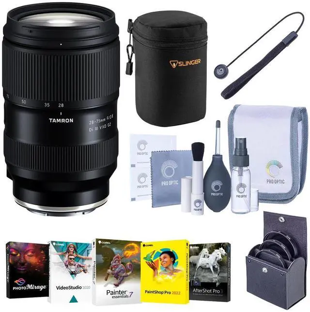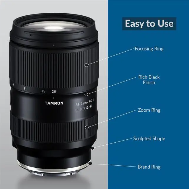 Tamron 28-75mm F/ 2.8 Di III RXD (Model A036). A high-speed standard zoom lens for Sony full-frame mirrorless cameras, Model A036 delivers superb optical performance, including both outstanding image quality and beautiful background blur effects (bokeh). Photographers may enjoy dynamic wide-angle expressions like never before thanks to a minimum object distance of 7.5 in at the wideangle zoom setting. Usefulness and versatility are enhanced by its compact size and light weight, measuring only 4.6 in and weighing 19.4 oz. Model A036 incorporates an all-new high-speed and precise AF driving system. The RXD (Rapid eXtra-silent stepping Drive) stepping motor unit operates with remarkable quietness, making it perfect for video use.