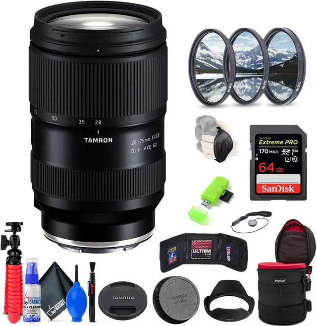 Bundle Items Include: Tamron 28-75mm f/2.8 Di III VXD G2 Lens for Sony E + 64GB Extreme Pro SD Card + 67mm Filter Set + 6-Inch Lens Case + Memory Card Wallet + SD Card Reader + Strap + Electronics Basket Cleaning Kit + Lens Cap. Versatile standard zoom designed for full-frame Sony E-mount mirrorless cameras but can also be used with APS-C models where it will provide a 42-112.5mm equivalent focal length range.. Bright constant f/2.8 maximum aperture affords consistent illumination throughout the zoom range and also affords greater control over depth of field for working with selective focus techniques.. VXD (Voice-coil eXtreme-torque Drive) linear motor focus mechanism provides fast, quiet, and precise autofocus performance throughout the zoom range.. Connector port works in conjunction with Tamron Lens Utility software for customizing lens functions and updating firmware through the lens rather than through the camera.