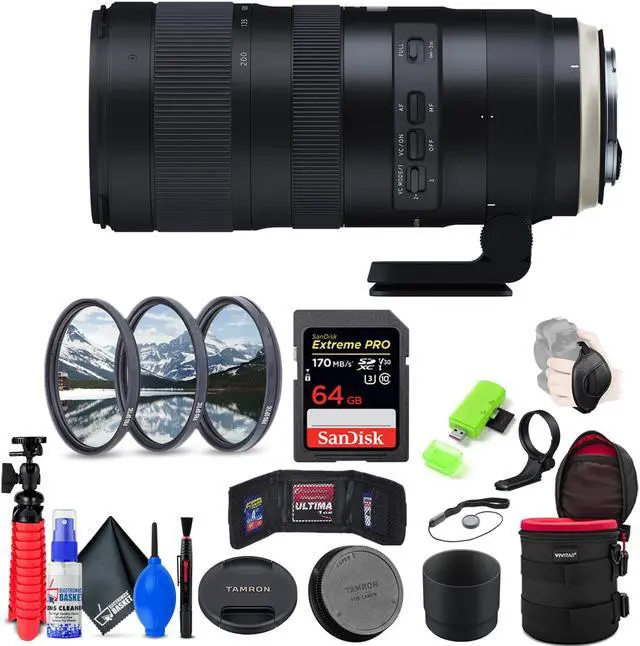 Bundle Items Include: Tamron SP 70-200mm f/2.8 Di VC USD G2 Lens for Canon EF + 64GB Extreme Pro SD Card + 77mm Filter Set + 10-Inch Lens Case + Memory Card Wallet + SD Card Reader + Strap + Electronics Basket Cleaning Kit + Lens Cap. Spanning a useful range of telephoto focal lengths, this lens is designed for full-frame Canon EF-mount DSLRs, however can also be used with APS-C models where it will provide a 112-320mm equivalent focal length range.. One XLD (extra-low dispersion) and five LD (low dispersion) elements are featured in the optical design to noticeably limit color fringing and chromatic aberrations for improved clarity, color fidelity, and apparent sharpness.. Both eBAND and BBAR coatings have been applied to suppress ghosting and lens flare for improved contrast when working in backlit conditions.. Constant f/2.8 maximum aperture benefits working in low-light conditions and affords consistent performance throughout the entire zoom range.