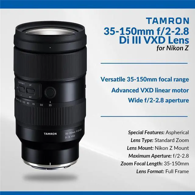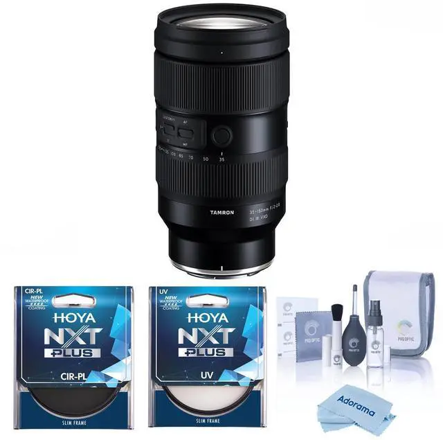 The Tamron 35-150mm f/2-2.8 Di III VXD Lens for Nikon Z comes in a feature-rich bundle that includes a flower-shaped hood, front and rear lens caps, a circular polarizer lens filter, a UV lens filter, a cleaning kit, and a high-quality microfiber cleaning cloth. This lens offers a versatile zoom range from 35mm to 150mm, covering everything from wide-angle to medium telephoto, making it suitable for a variety of photographic styles such as portraits, events, and travel photography. One of its standout features is the fast variable maximum aperture of f/2-2.8, which provides excellent low-light capability and enables a shallow depth of field for pleasing background blur. Designed with Tamron\u2019s Di III technology, it is specifically made for full-frame mirrorless cameras. The lens incorporates Tamron\u2019s VXD (Voice-coil eXtreme-torque Drive) linear autofocus motor, delivering fast, precise, and virtually silent focusing\u2014ideal for both stills and video. Additionally, it features the advanced BBAR-G2 (Broad-Band Anti-Reflection Generation 2) coating that significantly reduces lens flare, ghosting, and reflections, ensuring high contrast and accurate color reproduction. With an 82mm filter thread, the lens can accommodate standard filters, including the included UV filter which blocks harmful ultraviolet light. The microfiber cloths, including Adorama's ultra-fine microfiber "Symphony," provide a safe and effective way to clean delicate lens surfaces, gently lifting dust, smudges, and fingerprints without scratching
