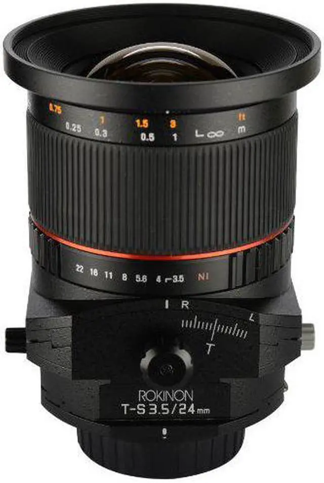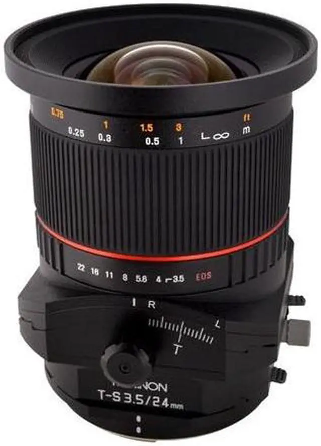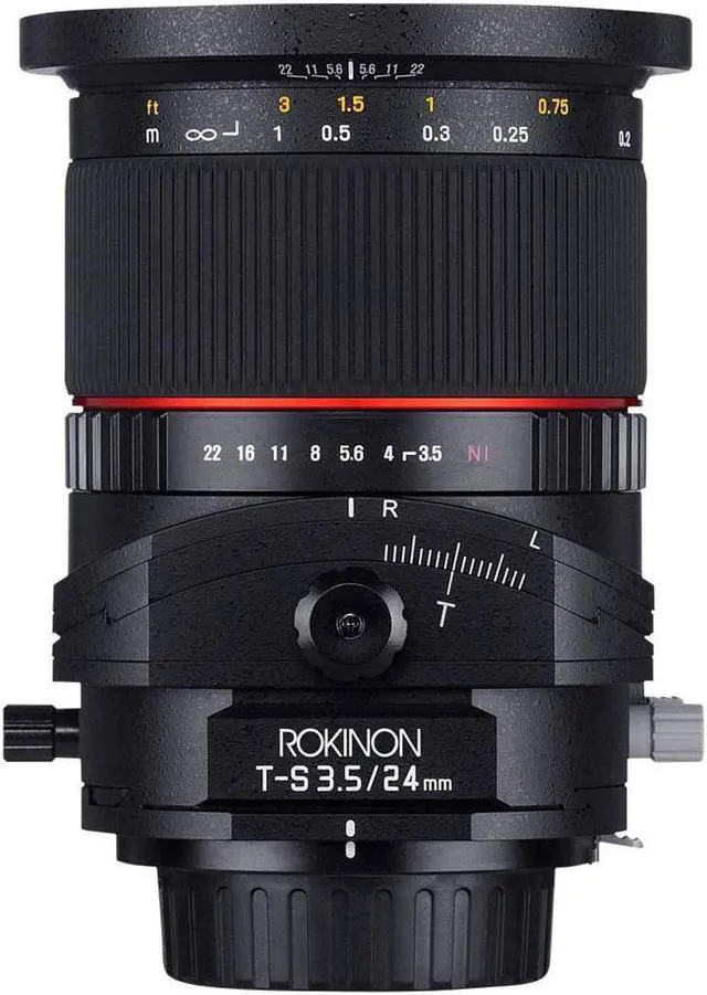 The Rokinon TSL 24mm F 3.5 ED AS UMC is a wide-angle, full-frame lens fitted with the perspective control and tilt-shift functions. Similar to the tilt and swing movements of a view camera, a tilt-shift lens allows the user to control perspective and correct convergence of lines within the frame, which can be especially useful in architecture, landscape and product photography. The optical tilt mechanisms enable precise control of depth of field along with perspective control. It is compatible with both digital and film formats with an angle of view of 83.5 º and on an APS-C size sensor has an angle of view of 59.9 º and focal length equivalent of 36mm (Canon