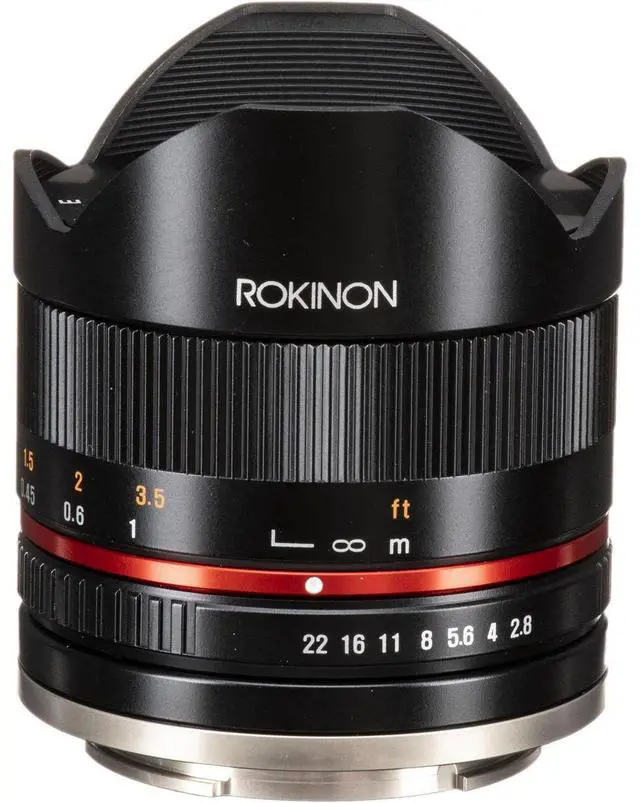The lens boasts an intricate optical construction of 10 lens elements arranged in 8 groups, including 1 ASP and 2 ED elements. This design ensures optimal optical performance, delivering sharp, high-quality images. The lens features an aperture range from f/ 2.8 to f/22, facilitated by six diaphragm blades, offering flexibility in various lighting conditions. The Rokinon 8mm fisheye lens incorporates an Internal Focusing (IF) system, ensuring the lens maintains its compact size even when adjusting focus. The lens also features the latest generation multilayer anti-reflection ultra multi-coating (UMC) to minimize lens flare and ghosting, enhancing image clarity and contrast.