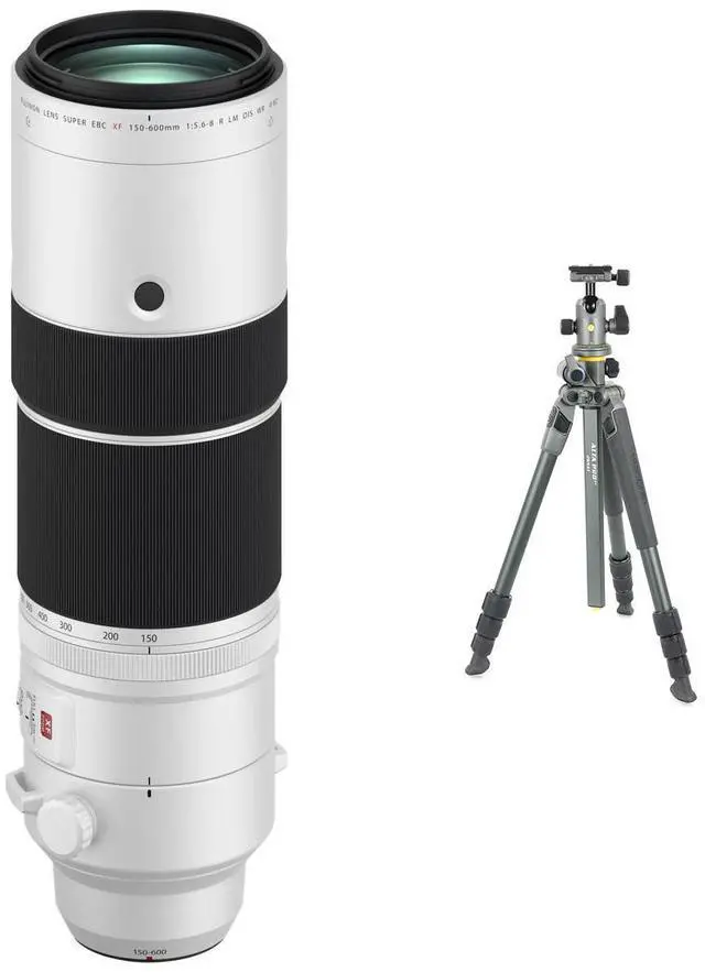Experience unparalleled photographic excellence with the Fujifilm XF 150-600mm f/ 5.6 -8 R LM OIS WR Lens, paired with the ALTA PRO 2+ 264AB 4-Section Aluminum Tripod. This exceptional lens bridges the gap between photographer and subject, offering an impressive full-frame equivalent focal range of 229-914mm. When used with the FUJINON XF 1.4X TC WR or XF2X TC WR teleconverters, this range extends to an astounding 320-1280mm and 475-1824mm, respectively. This extensive coverage makes it ideal for capturing distant subjects such as wildlife, nature, and intricate landscape details. The lens maintains a consistent physical length throughout its entire focal range, ensuring perfect balance when mounted on a multi-directional gimbal head and tripod.