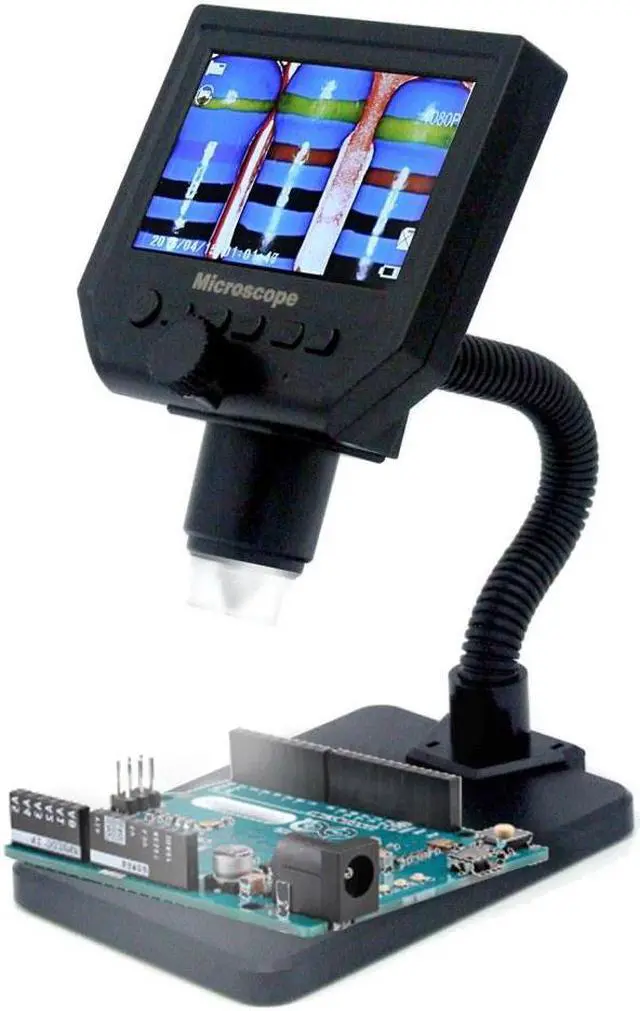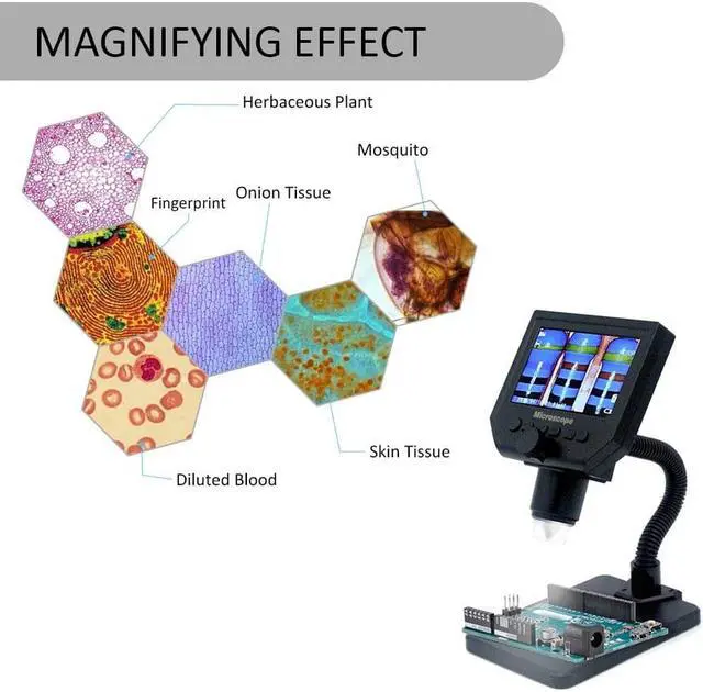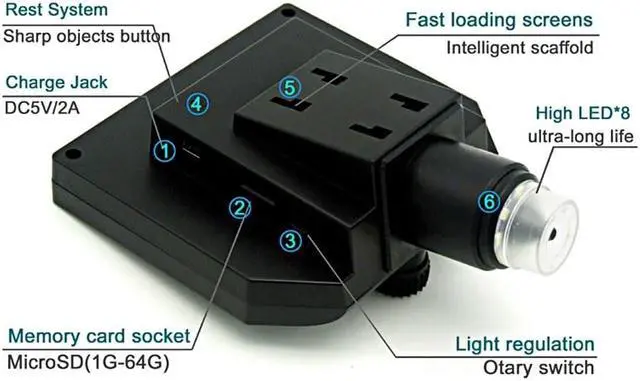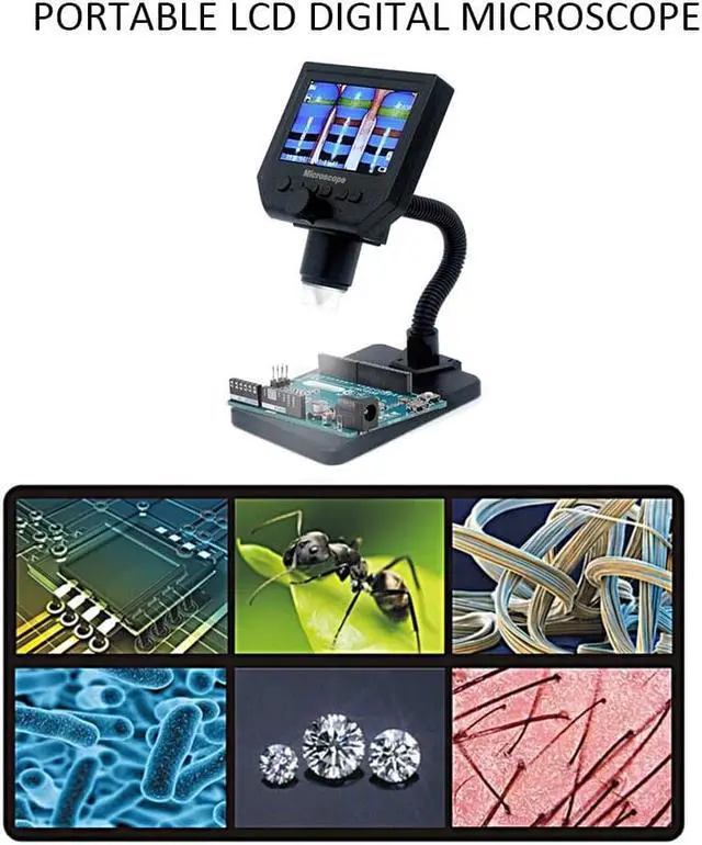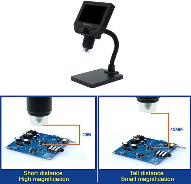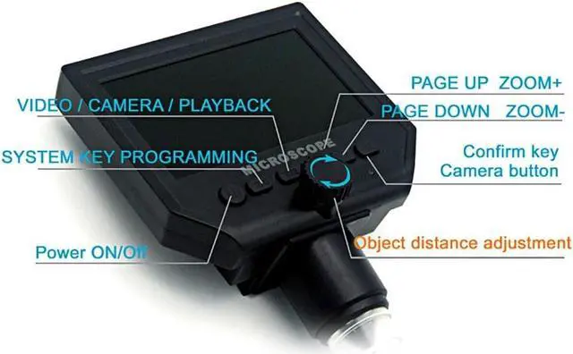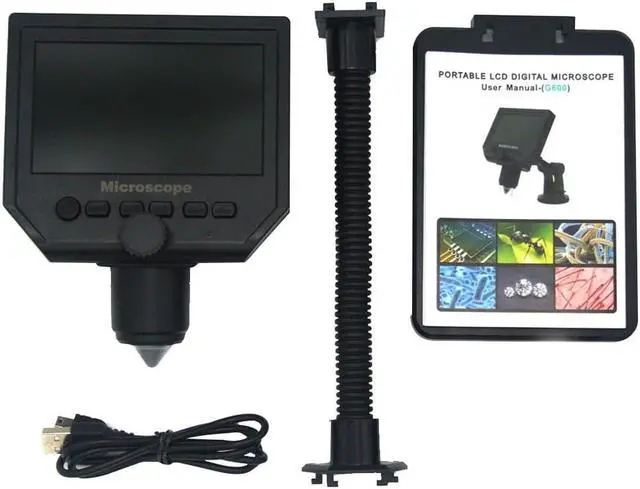 Mode Button: Recording Video Mode Taking photos mode: (5M, 2M, 1.3M, VGA) press OK button for taking photos Playback mode: delete, lock/unlock Button: left button, right button, OK button (photo/video, open key) Specifications: Material: metal+plastic Main color: black Input voltage: 110-240V Pixel: HD 3.6MP CCD Display: 4.3 inches HD LCD display Magnification: 1-600X continuous magnification system Object distance: 15mm-infinity (depend on the different distance) LED light quantity: 8pcs Battery: 1 * lithium battery, 3.7V, 2500mA (included) Battery continuous working time: about 6 hours Charging time: about 4 hours Power DC interface (5P MINI) Memory card's socket (Micro SD), supporting 1-64GB Package size: 205 * 160 * 80mm / 8.1 * 6.3 * 3.1in Package weight: 531g / 1.2lb It realized full HD, high object distance, multifunction, multi-output at the same time. And it's appearance design combines more ergonomic consideration, provides user better experience. Features: With built-in lithium battery, can work continuously for 6 hours. 4.3 inches HD LCD display, which is convenient to observe more detailed details. Supported language: English, Spanish, Russian, Korean, Japanese, Thai, Hebrew, Portuguese, German, French, Italy, Turkey, Czech, Poland, Traditional Chinese, simplified Chinese. High brightness 8 LEDs, available for working up to 100 thousand hours. Support inserting memory card to take photos and video for network sharing and computer saving. The stand is very stable and you do not have to worry about the shaking outside. Wide usage: mobile phone maintenance, QC inspection, education purpose inspection, industrial inspection, print industrial, jewelry collections, textile industrial and biological inspection. Function Setting Key: Resolution: 1080P, 720P, VGA Date tag: displayed / not displayed Motion detection: ON/OFF (When it's on, it will start to record a video automatically, as soon as detecting somethings moving.) Cyclic record: off / 3 minutes / 5 minutes / 10 minutes (If the memory card is full, it will delete the first video and save the new video automatically.) Exposure value: +2.0 (0) -2.0 Format: Yes/NO Language: 16 kinds of languages Automatic shutdown: off, 1 minutes, 3 minutes Automatic turn off the LCD : off, 1,3,5 minutes Factory reset: Yes/No Light source's frequency: 50Hz, 60Hz Time setting: year, month, day, hours, minutes, seconds Image rotating: ON/OFF Light: ON/OFF Software version: V1.10