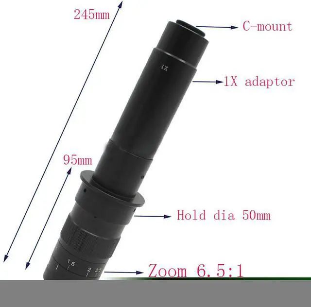 C-mount adapterZoom ratios: Objective Magnification Power by 0.7X - 4.5X (about 10X- 300X on the display)Size: 24.5 mm (L) * 50mm (DIA)