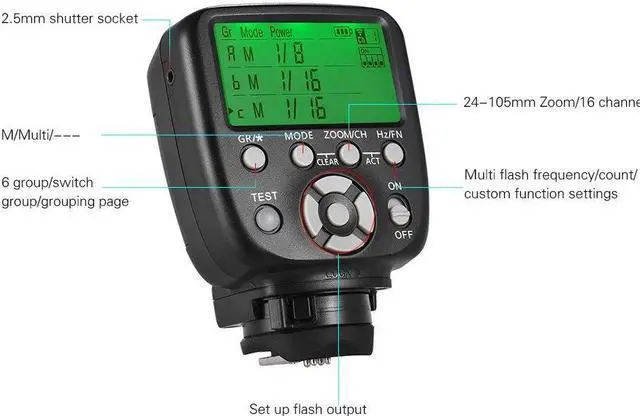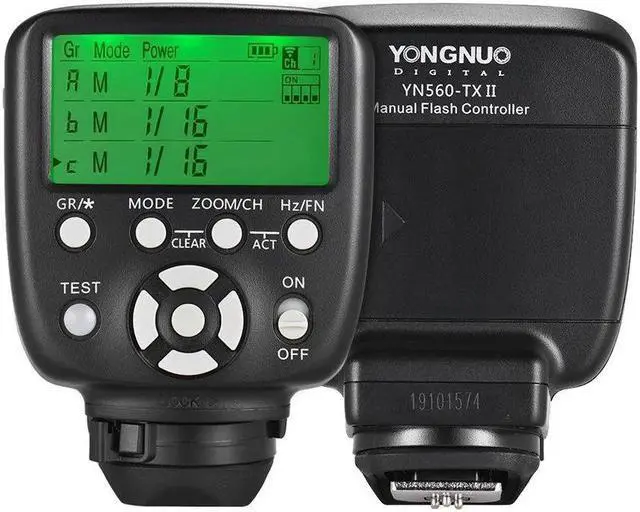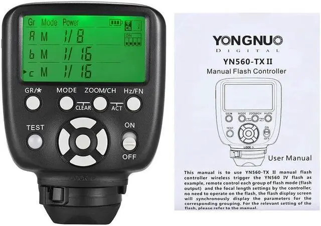 Specifications:Brand: YONGNUOModel: YN560-TX IIType: FSK 2.4G Wireless ControllerDistance: 100 metersWireless Channel: 16Flash Mode: M/MultiGroup Control: A/B/C/D/E/FZoom Range: 24-105mmShutter Interface: 2.5mmBattery Type: 2pcs AA Batteries (Not included.)Stand-by Time: 120 hoursItem Size: 89 * 65 * 42mm / 3.5 * 2.6 * 1.7"Item Weight: 80g / 2.8ozPackage Size: 10 * 7.5 * 5.8cm / 3.9 * 3 * 2.3"Package Weight: 118g / 4.2oz Features:For Nikon DSLR cameras.Support wireless trigger to YONGNUO YN560III/YN560IV/YN660/YN968N/YN860Li speedlite.Support wireless shutter receiver of RF-602/RF603/RF603 II/RF605.M/Multi flash modes.16 channels, transmission range: 100 meters.Remote control of flash output and zoom per group; up to 6 groups.Grouping show supports paging and scrolling mode; Customizable maximum grouping.Large and clear screen, user friendly keys.Exquisite fuselage design, with quick lock.