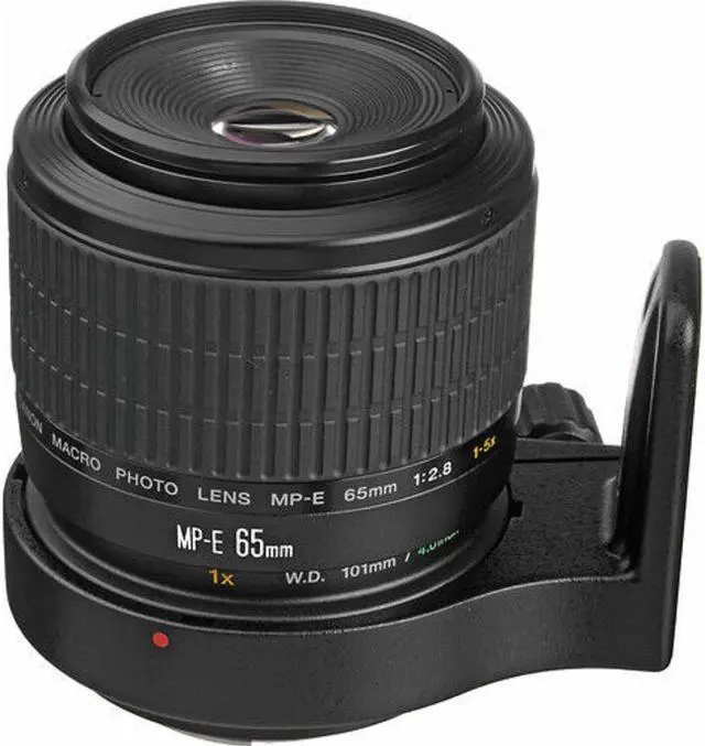 A specialty lens designed for extreme close-up imaging, the MP-E 65mm f/ 2.8 1-5x Macro Photo from Canon lets you render subjects at up to five-times life-size magnification with a minimum focusing distance of 9.4". Dedicated solely to macro applications, this lens's unique design employs a floating elements system to maintain quality throughout the focusing range and one ultra-low dispersion element helps to control color fringing and chromatic aberrations for high clarity and color accuracy. A Super Spectra coating has also been applied to suppress flare and ghosting for greater contrast. This 65mm f/ 2.8 is strictly manual focus operation only and features a removable rotating tripod collar for improved stability when working atop a tripod.