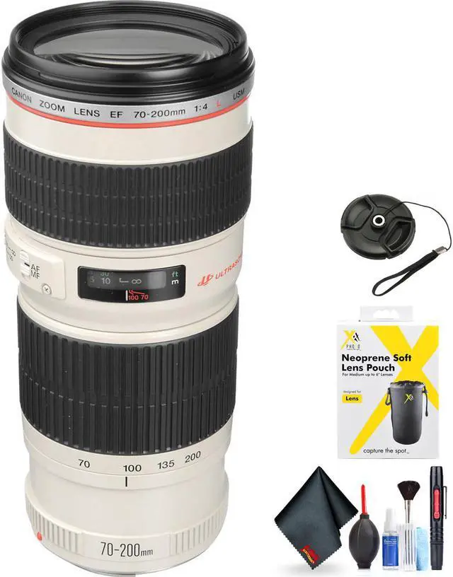 Capture the far-off action of fast-paced sports or zoom in for an intimate portrait with the Canon EF 70-200mm telephoto zoom lens. This high-performance, L-series telephoto zoom lens is distinguished by such features as an f/4 maximum aperture, an inner focusing system, and a ring-type ultra-sonic monitor (USM). The last two features combine to deliver quick and quiet autofocusing--a priority for many amateur and professional photographers. In addition, photographers can attach and use a circular polarizing filter without difficulty because the front lens element does not rotate during focusing. Compatible with the same tripod collar (sold separately) used with the EF 300mm f/4L USM lens, the lens carries a one-year warranty.