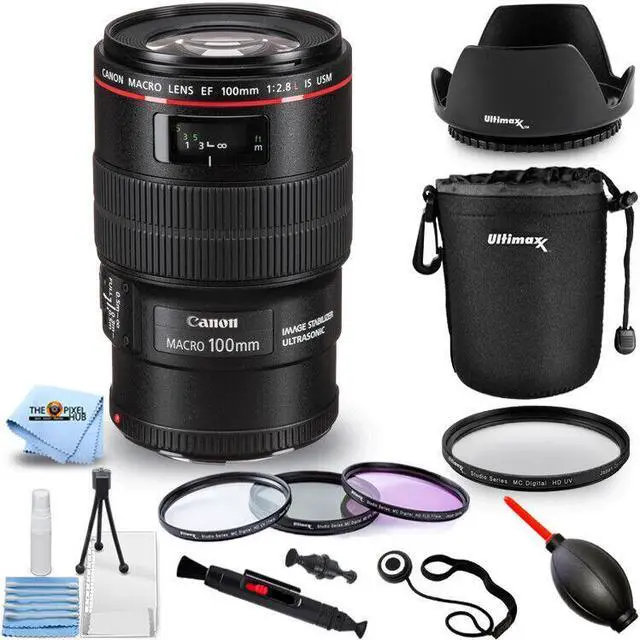 The Canon EF 100mm f/ 2.8L Macro IS USM Lens is a notably updated version of Canon's popular 100mm Macro lens. In its latest incarnation, the 100mm f/ 2.8L Macro joins Canon's esteemed L-series, and as such is held to a higher level of resolving power and overall construction. Other improvements found on the EF 100mm f/ 2.8L include Optical Image Stabilization with up to 4-stops of shake control, and a refined Ultrasonic Motor (USM) for quicker and quieter auto-focusing with full-time manual override. Like its predecessor, the Canon EF 100mm f/ 2.8L allows for a comfortable, shadow-free shooting distance between the front of the lens barrel and the subject with life-size ( 1:1 ) magnification. Optional extension tubes increase this magnification for exceptional close-up detail. This lens is compatible with an optional Canon tripod collar.