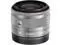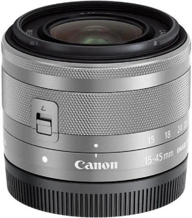 A standard zoom covering wide-angle to short telephoto perspectives, the silver EF-M 15-45mm f/ 3.5 - 6.3 IS STM Lens from Canon offers a 24-72mm equivalent focal length range when used with APS-C-format EOS M-series mirrorless cameras. The optical design incorporates three aspherical elements, one of which is glass-molded and the other two are precision molded, in order to control chromatic aberrations and distortions throughout the zoom range. The lens placement has also been optimized, and coatings have been applied, to reduce flare and ghosting for increased contrast and clarity when photographing in difficult lighting conditions.
