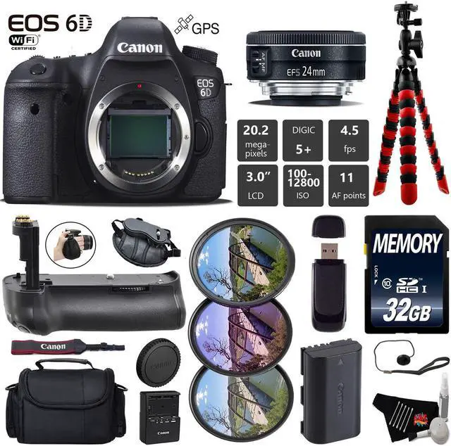 Bundle Includes: Canon EOS 6D DSLR Camera (Body Only) Canon EF-S 24mm f/ 2.8 STM Lens Professional Battery Grip Multi-Coated 3 Piece Filter Kit (UV-CPL-FLD) 32GB SDXC Class 10 Secure Digital High Speed Memory Card Deluxe Digital Camera/Video Padded Carrying Case Flexible Tripod DSLR Wrist Strap Lens Cap Keeper High-Speed Card Reader Lens Tissue Paper Cotton Swabs Lens Cleaning Solution 6Ave MicroFiber Cloth In the