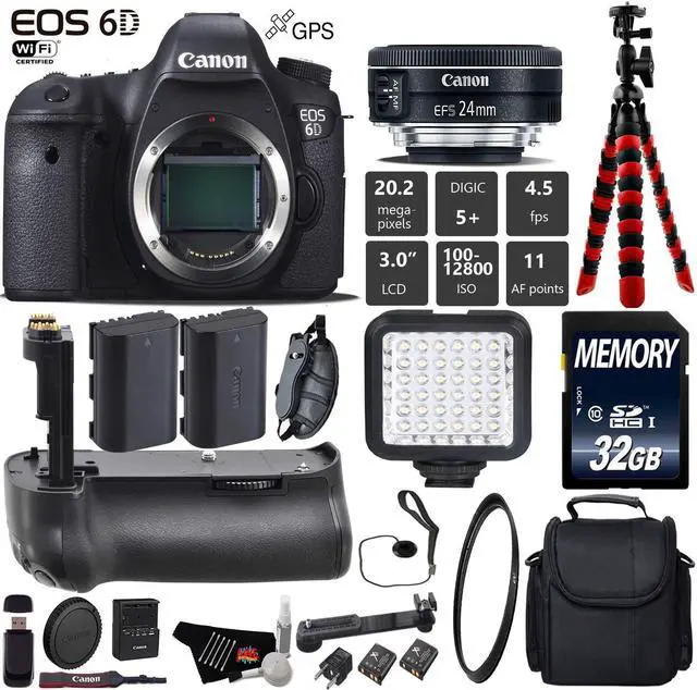 Bundle Includes: Canon EOS 6D DSLR Camera (Body Only) Canon EF-S 24mm f/ 2.8 STM Lens Professional Battery Grip UV Protection Filter Mini Portable LED Light Kit With 2 Batteries, Charger & Bracket Extra Battery 32GB SDXC Class 10 Secure Digital High Speed Memory Card Deluxe Digital Camera/Video Padded Carrying Case Flexible Tripod DSLR Wrist Strap Lens Cap Keeper High-Speed Card Reader Lens Tissue Paper Cotton Swabs Lens Cleaning Solution 6Ave MicroFiber Cloth In the