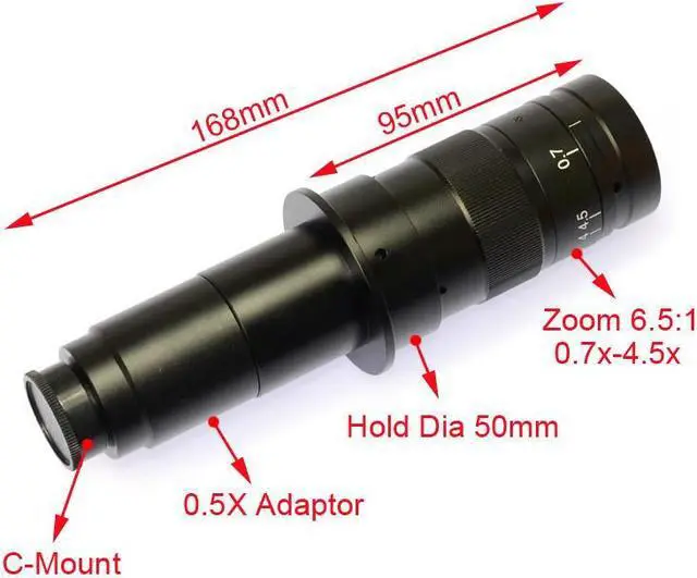 C-MOUNT Lens:Working Distance: 95mmZoom C-mount Lens0.5X C-mount adapterzoom ratios: 6.5:1Objective Magnification Power by 0.7 - 4.5X(about 10 - 180X on the display)Size: 180mm(L) * 50mm(DIA)Weight: 450g Specification:Image Sensor: 2.0 megapixel Panasonic sensor 1/2.5" inch CMOSEffective Pixel: 1920H*1080VPixel size: 3.0um * 3.0umData Bits: 10bitFrame rate: 30fpsDefinition: Maximum Resolution of 900TV lines AboveScanning Mode: Line-by-LineShutter Type: Electronic ShutterDynamic Range: >90dBSNR(Signal to Noise Ratio): 55dBSensitivity: 2.0 V/lux-sec (550nm)Exposure Mode: Auto/manualWhite balance: Auto/manualLens: C/CSVideo Interface: Standard HDMI/VGA InterfaceOutput Resolution: 1920X1080 60Hz; 1024X768 60Hz; 1280X1024 60Hz
