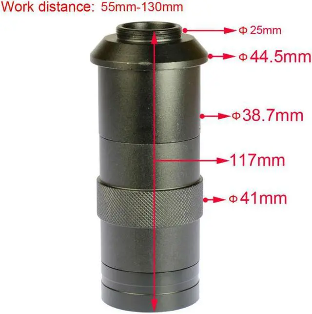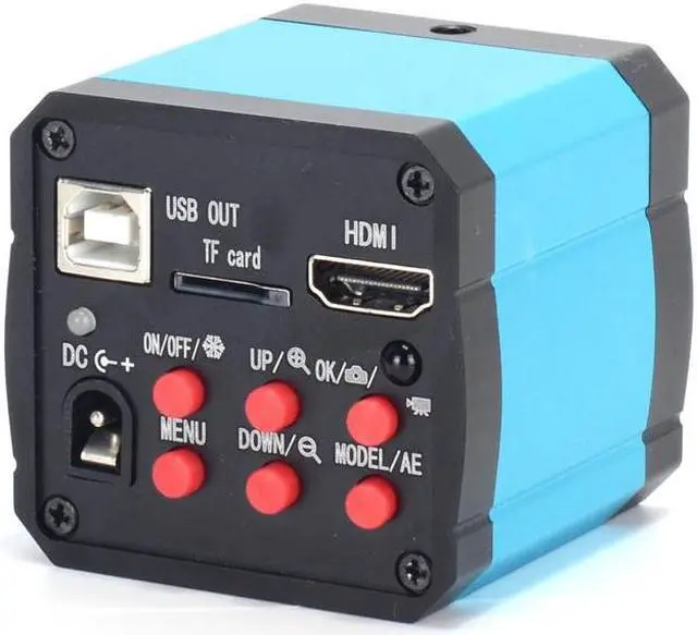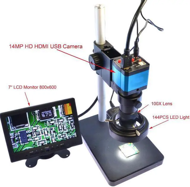 C-MOUNT Lens:Zoom c-mount LensMagnification Power by 0.12 - 2X (about 8 - 100X on the display)Work distance:55mm-130mmVisual field :2.4mm-32mmSize: 115mm(L) * 40mm(DIA)Weight: 210g LED light's Feature:56 bright white LED bulbs100,000 hours of lifeIntense and focused shadow-free illuminationThe brightness of 0-100%Adjustable,high brightnessVariable intensity controlPower input: 100-240V, 50-60HZSuit for the dia of the lens: 30mm-63mm Feature: Image sensor14 megapixel Panasonic sensor 1/2.3 inchEffective pixel14 megapixelPixel size1.43*1.43umFrame rate60fpsDefinitionFULL HDHousingmetalLensCS for test, custom provideWhite balanceAuto/manualDigital magnification5 times digital zoomBrightness controlAuto/manualColorR/G/B adjustableFreezeSupportOSDSupportFilm and recordSupport Cross cursorSupport multi-color, size adjustableTransverse and vertical lineSupport multi-color, 5pcs of transverse lines/vertical lines, moveableSNRSupportTF card interfaceMax 64GHDMI interfaceStandard HDMI output (Type A)LensCUSB interface Standard usb2.0 interface (Type B)Specification:Model: Camera with HDMI USB2.0 two outputImage format: jpg,png,tiffImage resolution: 4320*3240 (for TF card) 1920 *1080 @ 60FPS(for TF card)Video format: MP4Video recorder: 1920 *1080 @ 60FPS (for TF Card)USB Video resolution: 1920 *1080 @ 30FPSWhite Balance: AutoLight: AutoColor: ColorNegative: SupportMorror: Left/right,Up/DownFreeze: SupportOSD: English/ChineseLine: different color,5 horizontal line , 5 vertical line,any positions
