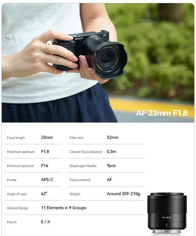 Versatile 35mm-EquivalentWith the 23mm focal length (35mm equivalent), this lens is perfect for street photography, landscapes, portraits and more. It offers versatile performance, capturing a wide range of scenes with a natural perspective. This lens brings your vision to life with its wide angle and exceptional sharpness, making every shot a true reflection of the moment. Weighing only 210 grams, this lens is perfect for capturing everyday memories on the go.