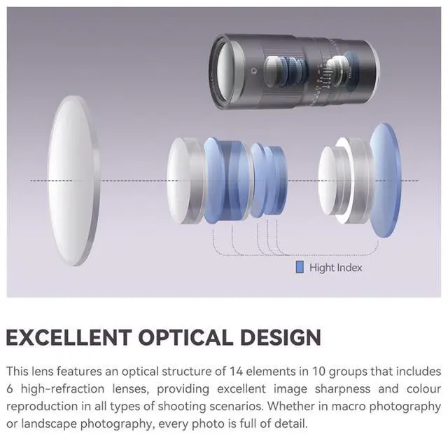 This feature enhances the convenience and adaptability of your shooting setup. The TTArtisan 100mm f/ 2.8 Macro 2X lens also offers a closest focusing distance of just 0.25 meters, enabling photographers to get exceptionally close to their subjects while maintaining sharp image quality. Its excellent optical design, featuring high-refraction lenses, ensures superior image sharpness and vibrant color reproduction, whether you're shooting macros or landscapes. Constructed with an all-metal body, this lens not only provides enhanced durability but also offers a premium feel and texture. Additional features include anodized aluminum construction, a clicked aperture, and a flocked-lined metal front cap, adding to the lens's robust and refined design.