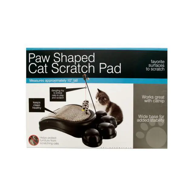 Let your cats play and scratch! The Paw-Shaped Cat Scratch Pad gives your cats a place to have fun and keeps their claws healthy, while protecting your furniture from scratches. It includes a dangling toy on a pole to entice your cats to play and scratch. It works great with catnip, and measures approximately 10" tall with an 11.5" base for added stability.