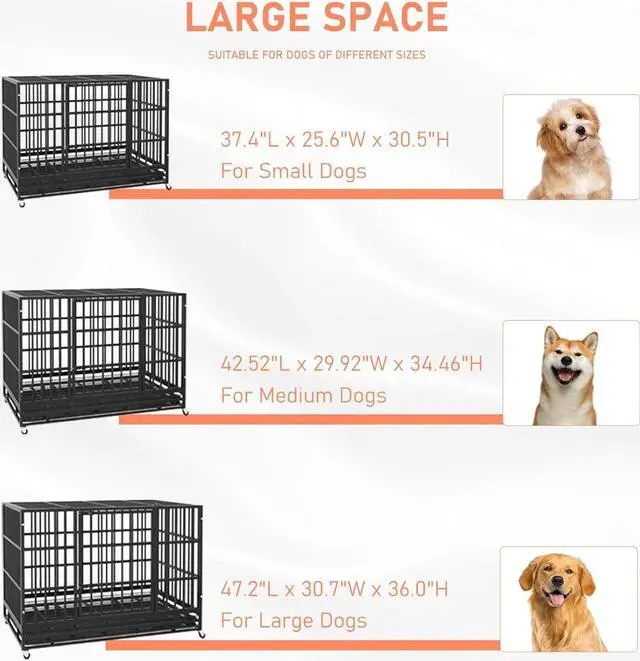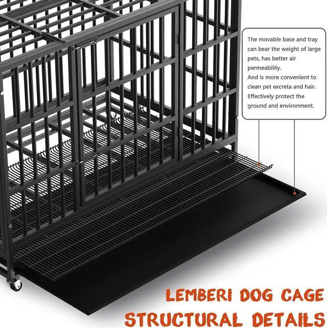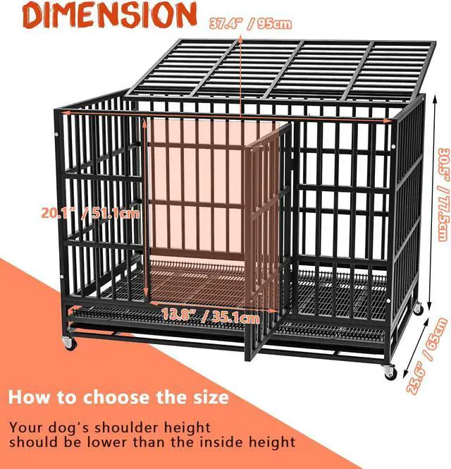 Indestructible Heavy Duty Dog Crate:The 38 inch dog crate is a 20-gauge steel crate with reinforced 0.5-inch-diameter steel tubes. It is durable, with strong joint welds and dual latches on the door.Safe And Convenient Design: This large dog crate is made of steel with a non-toxic, rust-resistant finish. It has a front door for easy access and the top door can also be opened for you to interact and exercise your dog. Easy To Clean: There is a slide out tray underneath the floor grate for easy cleanup. The grate is very well sized to not only let the dog food and excrement fall, but also to keep your dog stand firm. Easy To Assemble & Move:The four casters on the bottom are lockable,which makes it difficult for high anxiety dogs to escape or cause injury to themselves or damage to the cage.Great Heavy Duty Dog Crate For The Money: This dog cage is specially designed for German Shepherd, Golden retriever, Labrador and other large dogs.