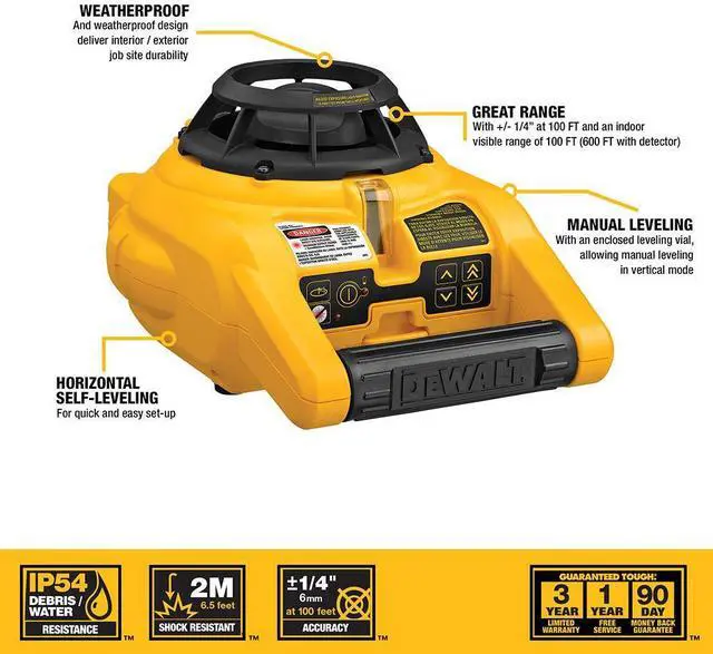DeWalt's new DW074K Self-Leveling Interior/Exterior Rotary Laser Kit provides the necessary tools for interior and exterior leveling all in one package. With a self-leveling range of 5 Degrees and a pinpoint accuracy of 1/4 in. at 100 ft., the DW074K is the perfect solution to getting accurate levels and readings every time. Built with a durable, jobsite ready housing it easily handles outdoor use and is even easier to use outside with the DW0740 Digital Laser Detector, which can extend the operating range up to 600 ft.