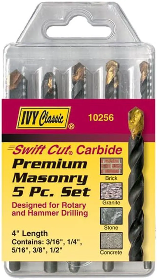 Tungsten Carbide Reinforced Head, Black Oxide Finish Contains the following drills: 3/16" x 4", 1/4" x 4", 5/16" x 4", 3/8" x 4", 1/2" x 4" Plastic re-usable drill index with bits clearly visible. Round shank designed for rotary and percussion hammer drilling. Drills through block, brick, stone, concrete & marble. Induction-hardened body for straightness & strength. Precision-ground tips are carbide grade BC20. Engineered with wide flutes for fast dust removal. 3/8" reduced shank on 1/2" bit