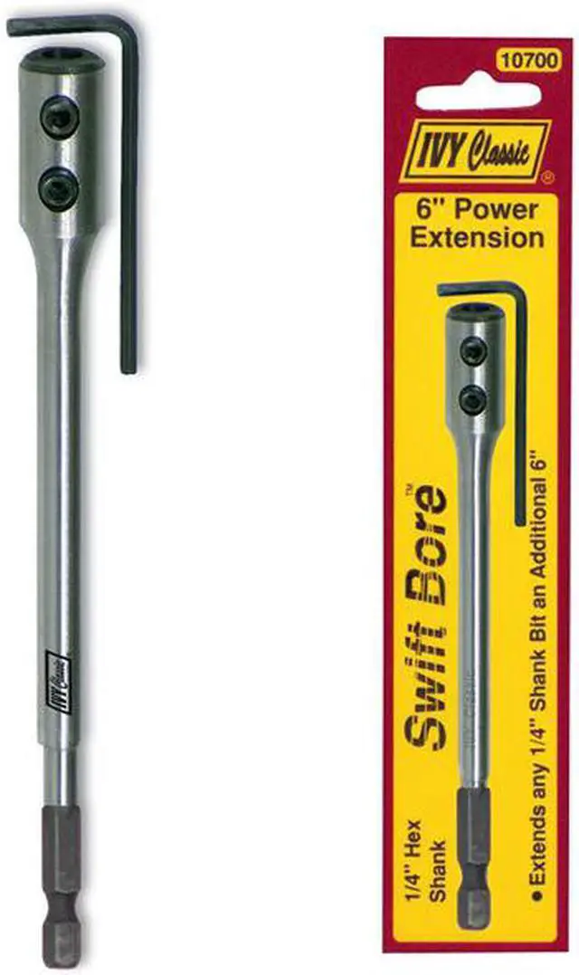 Ivy Classic, 10700, Wood Spade Bits Extensions, 6" Drill Bit Extension, Double Set Screw With Allen Wrench, Recommended For All 1/4" Round Shank Drill Bits Requiring Extra Reach, Follows 5/8" & Larger Bits Through Hole, 1/4" Shank, Pouched, Carded.