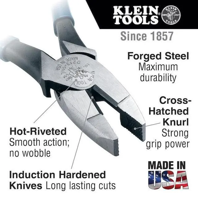 Pliers, Linemans Pliers, Linemans Plier, Jaw Length 1 19/32 in, Jaw Width 1 1/4 in, Jaw Thickness 5/8 in, Overall Length 9 1/2 in, Handle Type Dipped, Material Carbon Steel, Tether Capable, Nonsparking No, Insulated No, High Leverage Yes, Wire Crimper No, Fish Tape Puller No, Spring Return No, Features