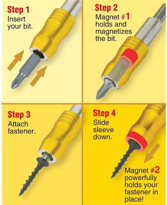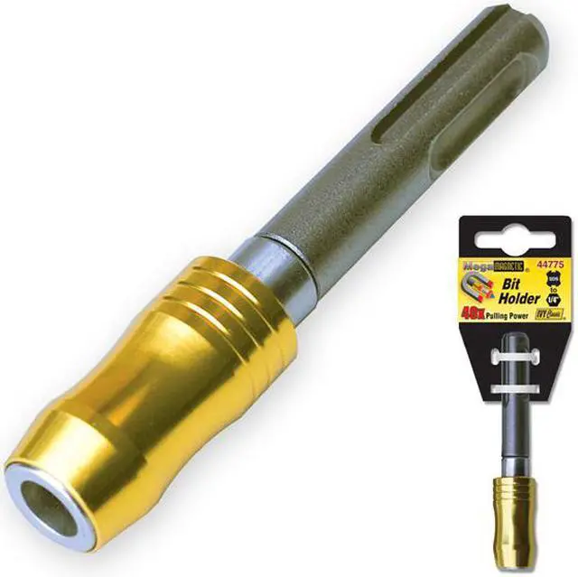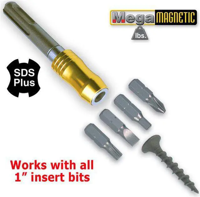 Mega-Magnetic Bit Holder - 2 powerful magnets create 40x the pulling power of an ordinary magnetic bit holder Magnet #1 holds and magnetizes the bit while magnet #2 powerfully holds your fastener in place! (See illustrations) Works with all 1" insert bits Chrome vanadium steel shank with solid stainless steel body. For rotary use only. Patented in the USA