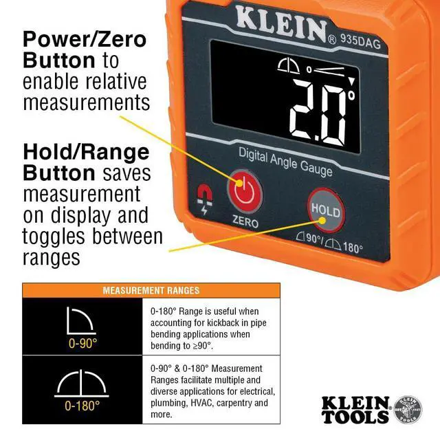 - 0 to 90-Degree and 0 to 180-Degree measurement ranges provide easy use in applications such as woodworking, bending conduit, installing electrical panels, and working on machinery