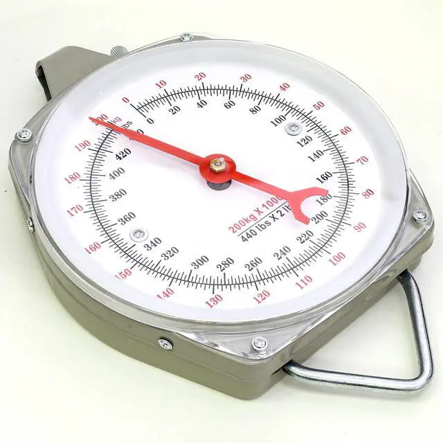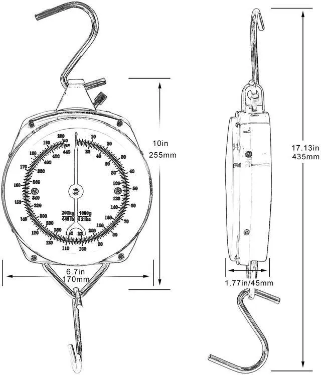 Specifications: --Weighing up to 440lb or 200kg--Material:heavy duty steel construction--With 2 steel S-hooks for quick attachment--Displays weight in both pounds and kilogramsPackageIncludes: --2xS Hook--1 xHanging Spring Dial Scale