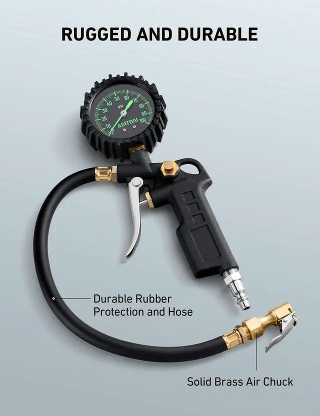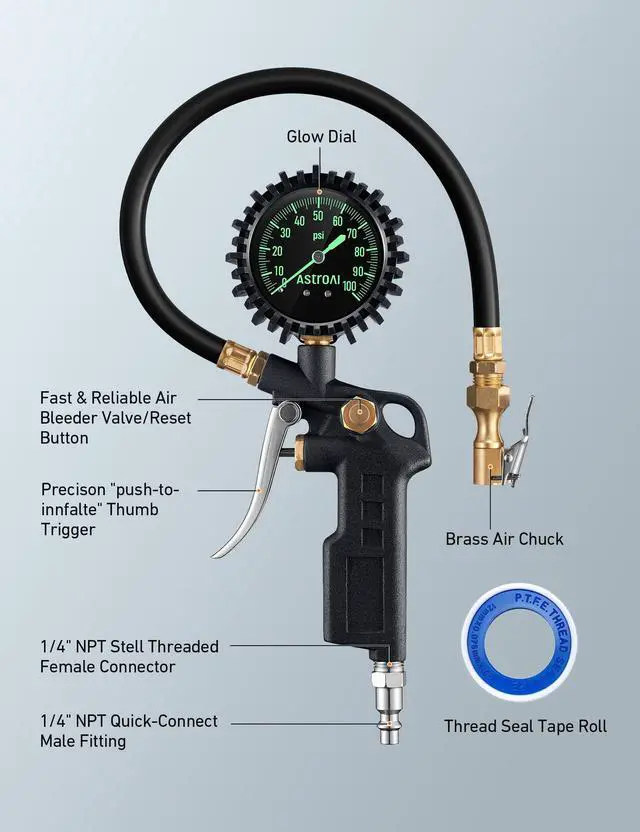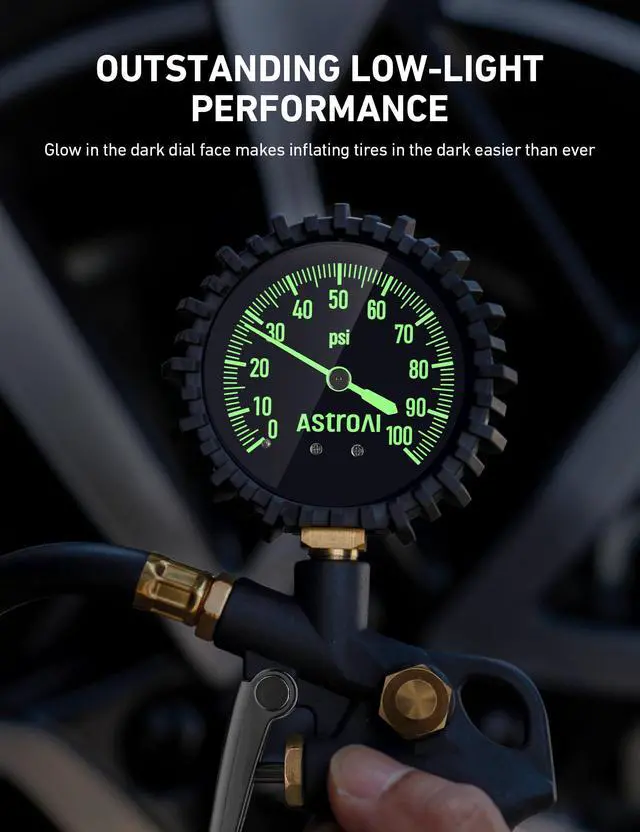 The glow dial makes it easier and more accurate to inflate, deflate and check pressure. AstroAI Analogue tire pressure gauge can meet the 2-3% Grade B40.1 International Accuracy Standard with a resolution of +/- 1 PSI and a range of 0-100 PSI. No more guessing with large 2.5" easy read glow dial tire gauge!