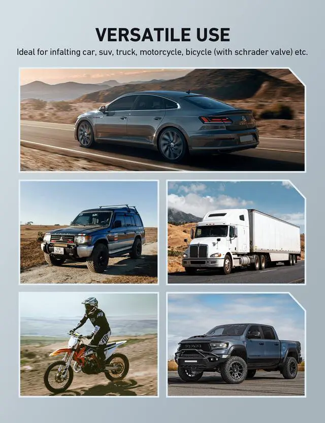 Reliability Durable construction ensures reliability in most conditions. | Quick Connection Connect quickly and start inflating. | Risk Prevention Helps prevent underinflation risks and enhances driving safety. |