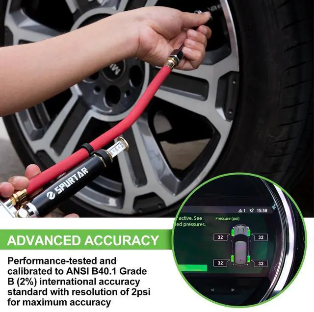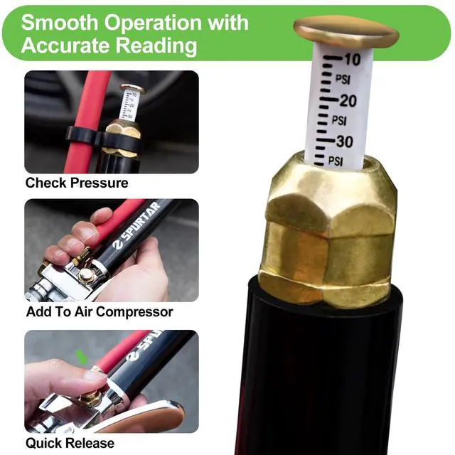 Spurtar 10-120 PSI inflator gauge kit help you maintaining proper tire pressures improves vehicle handling, reduces the risk of tire failure, improves fuel economy, and increases the life of your tires