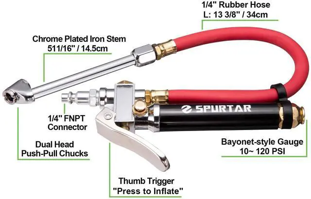 It is nearly impossible to inflate a tire without the correct air chuck. An air chuck allows the air to flow in the desired direction. The best tire inflator gauge is small enough to take anywhere, robust enough to handle high and low tire pressures alike, and versatile enough for easy, accurate use No garage or shop is complete without a Spurtar Air Chuck.