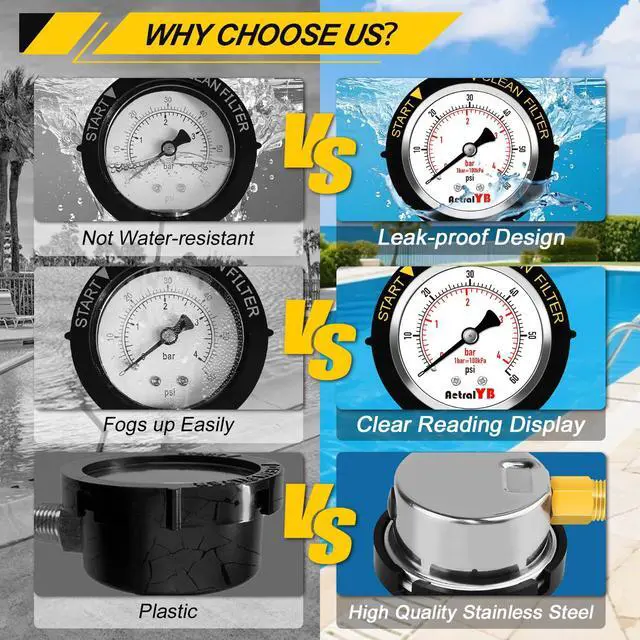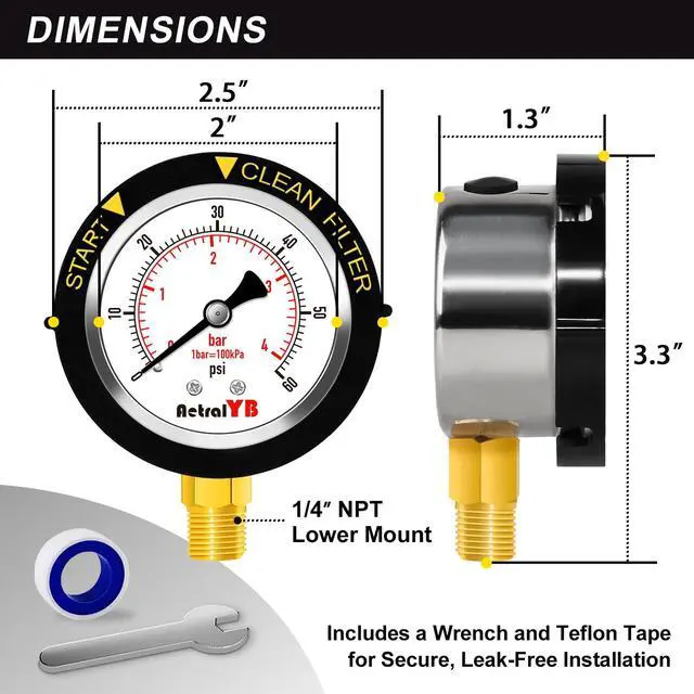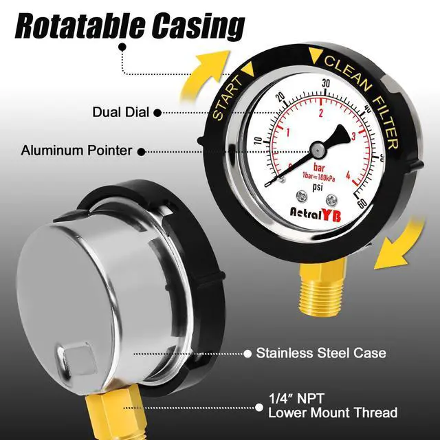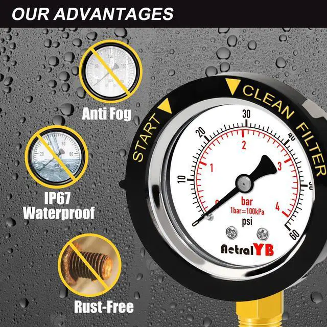 IP67 WATERPROOF + CLEAN FILTER INDICATOR IP67-rated for full water and dust protection. Bottom 1/4" NPT mount fits most pool systems. Rising pressure indicates a dirty filter, helping you maintain efficiency with timely cleaning or backwashing