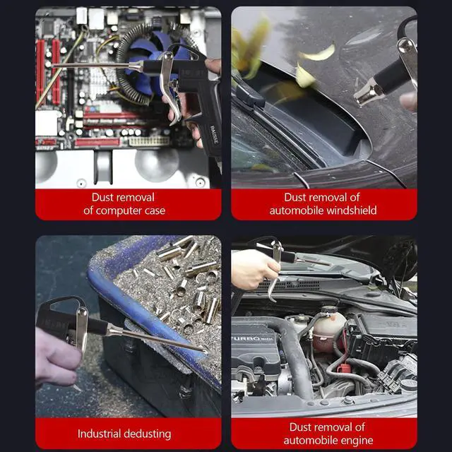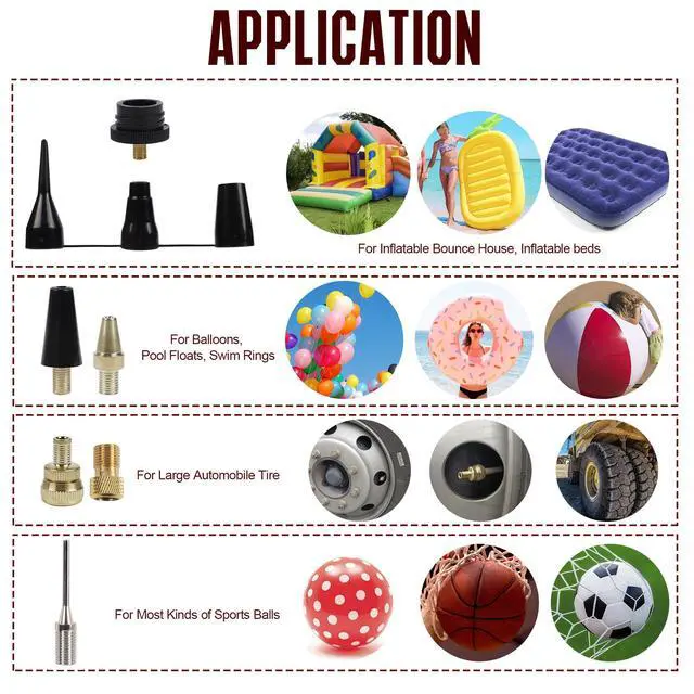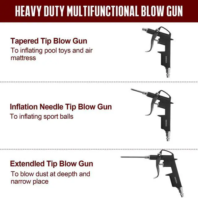 All-purpose use for bicycles, air mattresses, balls, etc. Air blow gun including 2 extension nozzles.