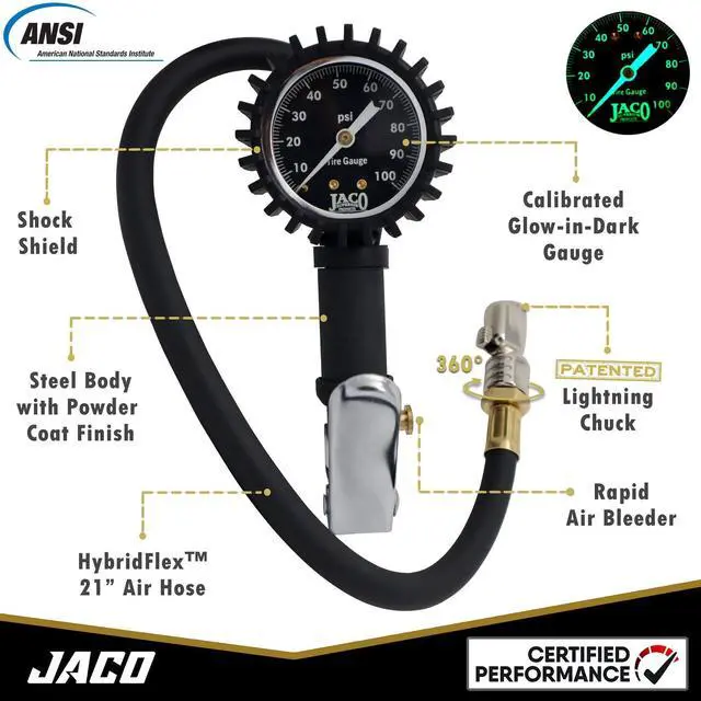 - Calibrated accurate - to ANSI B40.1 Standards (±2% center), providing the ability to measure, inflate, and deflate tires with precision up to 100 PSI without relying on batteries.