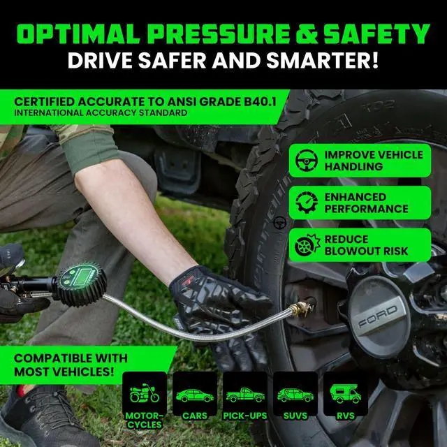 The large, easy-to-read digital screen makes for seamless night visibility, a great option for filling tires day or night.