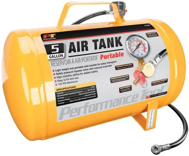 Take pneumatic power on the go with this 5 gallon air tank. This air tank can hold up to 125 PSI and it features a convenient carrying handle so you can take it on the go. Use the on/off air adjustment dial for greater control over the flow of air. This tank also features a safety pressure bypass valve with a manual override so you don't need to fret about overfilling. Use the industrial grade air hose and the included standard tire chuck to fill tires on bikes, lawn mowers, cars, trucks, and any vehicle with pneumatic tires. Whether you're inflating tires, powering air tools, or using air pressure to clean your workspace, this portable air tank gives you the portability you need to get the job done.